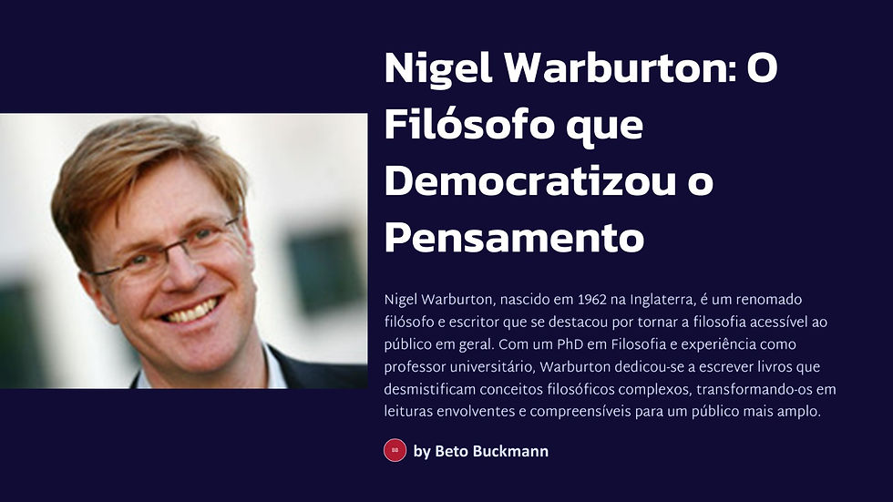 Nigel Warburton é um dos maiores divulgadores da filosofia contemporânea. Sua capacidade de tornar complexas ideias acessíveis e sua paixão por compartilhar o conhecimento o tornaram um dos autores mais lidos e admirados do mundo. Sua obra é um legado para as futuras gerações, inspirando novas gerações de filósofos e pensadores críticos.