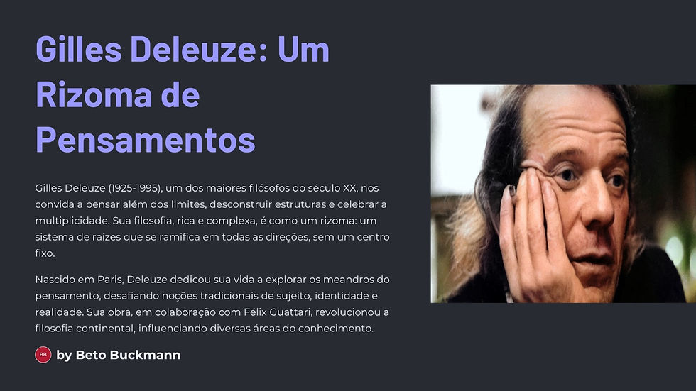 Gilles Deleuze, (1925/1995) um dos maiores filósofos do século XX, nos convida a pensar para além dos limites, a desconstruir as estruturas e a celebrar a multiplicidade. Sua filosofia, rica e complexa, é como um rizoma: um sistema de raízes que se ramifica em todas as direções, sem um centro fixo.