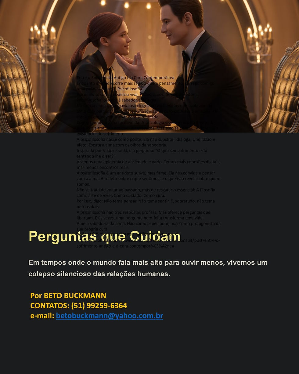 A psicofilosofia, portanto, não se limita ao consultório ou à academia. Ela habita os silêncios entre as palavras, os olhares que escutam além do dito, as perguntas que não querem consertar, mas acompanhar. Ela sabe que curar não é eliminar o sofrimento, mas dar-lhe um lugar onde possa ser nomeado, partilhado, transformado.